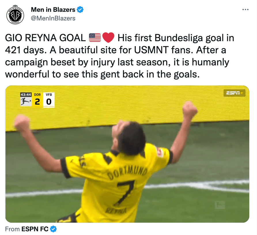 Four hundred and twenty one days. That’s how long it had been since Gio Reyna 🇩🇪 last scored for Borussia Dortmund. Until Saturday, that is, when, in the 44th minute against VfB Stuttgart, he curled in this beauty of a far-post finish.