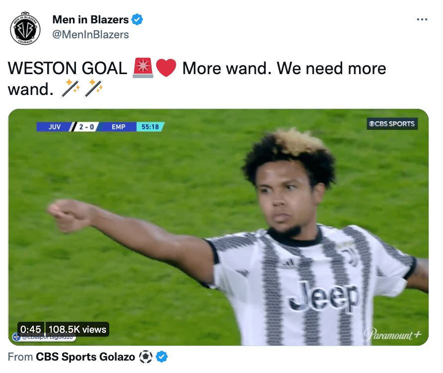 Further reason for USMNT fans to rejoice: Weston McKennie 🇮🇹 has scored two goals in his last two matches for Juventus. The first came Friday via a bullet header off a corner kick in Juve’s 4-0 win over Empoli (watch below). The second was an instinctive, swiveling finish in Juventus’ Champions League loss to Benfica Tuesday (WATCH HERE).