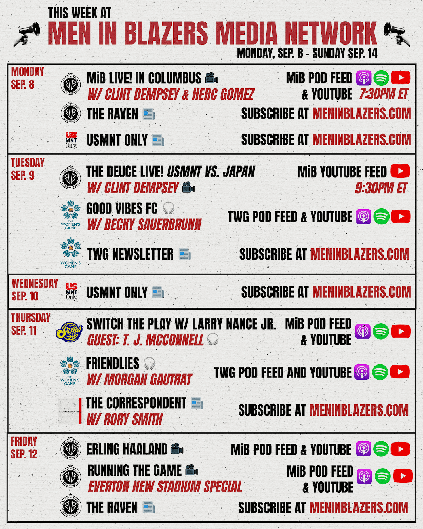 iii. Lastly, for all our friends in New York, weโd love if you joined us at Terminal 5 on Sept. 18 for a night of celebration featuring basketball stars Karl-Anthony Towns and Josh Hart, and to revel in the magical kingdom that is New York sports and its singular football culture with our friends at MLS and Walmart. If youโre in town, come be with us. Doors open at 6:30 p.m. and we start at 7:30 p.m. Tickets are here.ย ๐